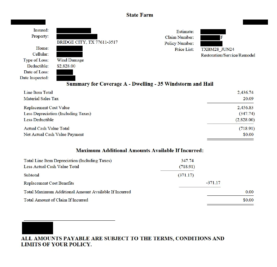 After a severe storm hit Bridge City, a homeowner turned to their insurer, State Farm, to file a roof damage claim. The result? State Farm’s adjuster estimated the damages at less than $2,500—an amount below the policy deductible. The insurance company paid nothing, leaving the homeowner with extensive damage and no support.