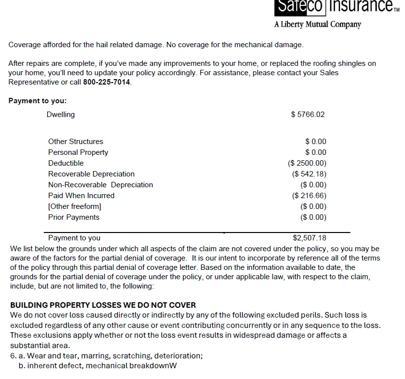 After promptly filing a claim with American Economy Insurance Company for hail damage, the homeowner received a letter they hadn’t expected. The insurer acknowledged some coverage for hail-related damage but denied coverage for “mechanical damage,” citing policy exclusions like wear and tear, deterioration, and inherent defects.