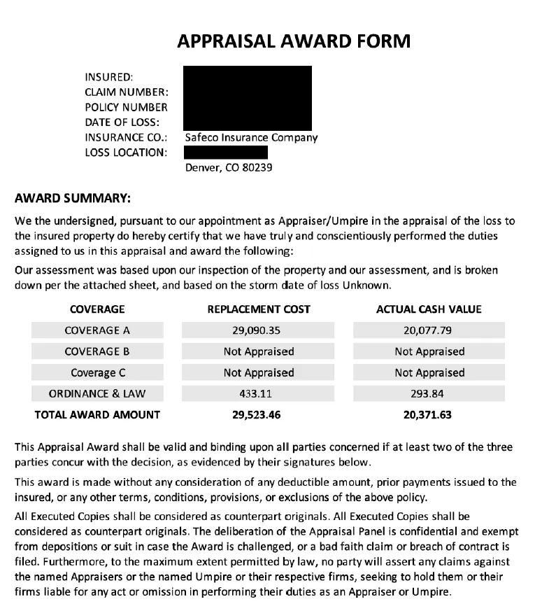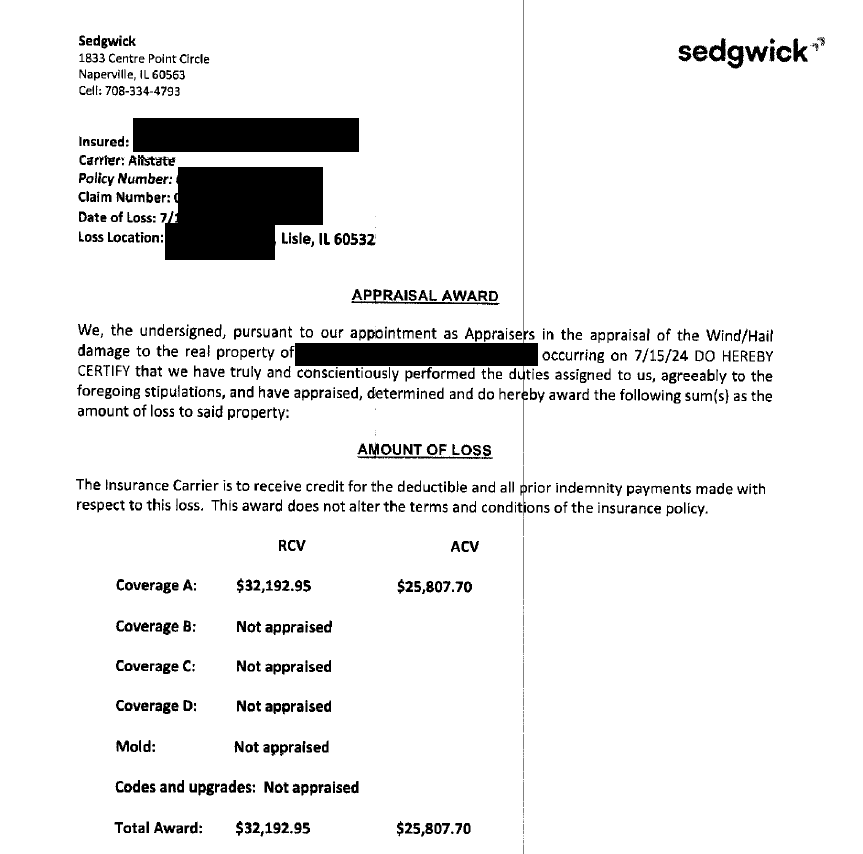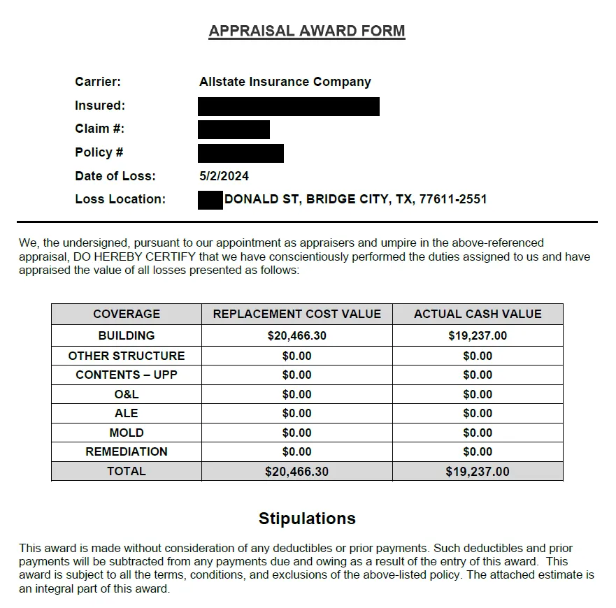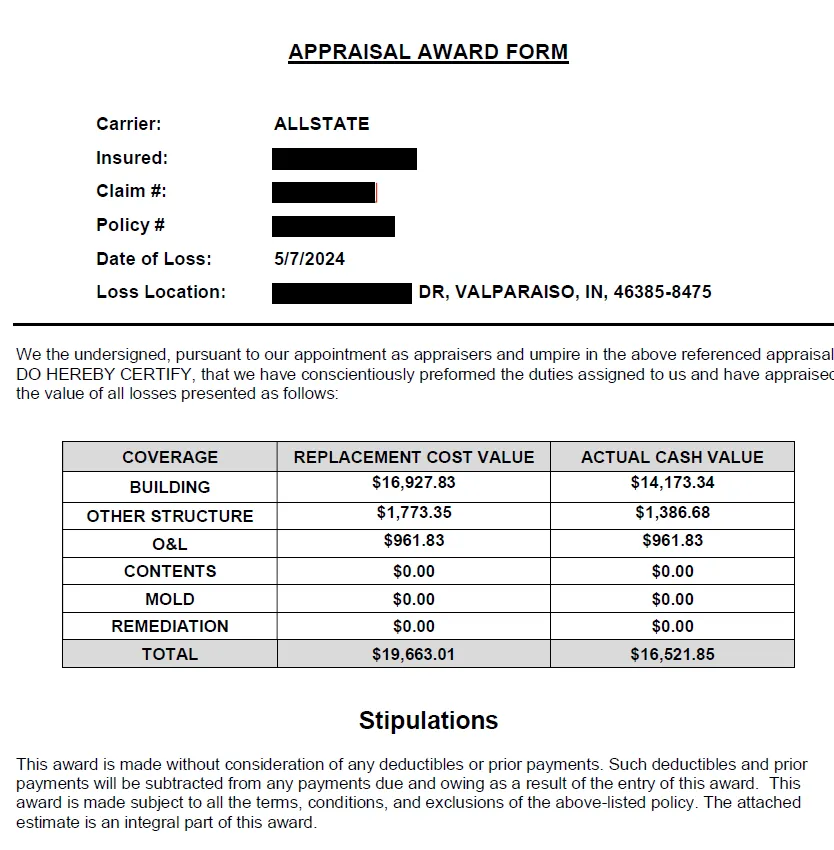 Appraisal isn’t just about presenting facts—it’s about negotiation, expertise, and understanding policy language. Over the next week, Independence Claims and Allstate’s appraiser exchanged findings and worked through discrepancies.