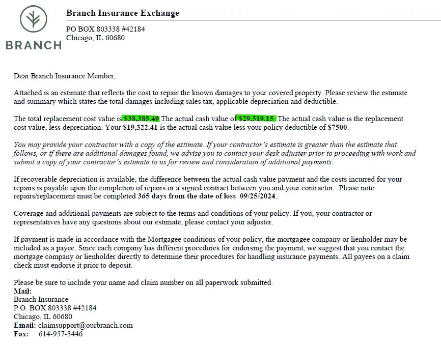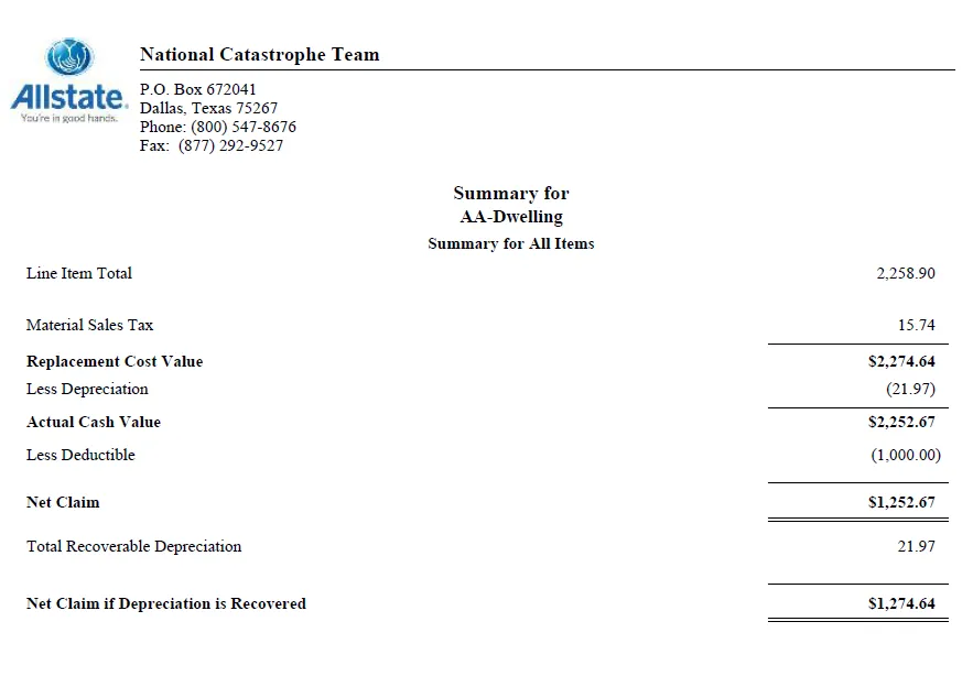 On May 7, 2024, a windstorm and hailstorm damaged Sarah’s home at 375 Stonehill Dr. Like any proactive homeowner, Sarah filed a claim with Allstate, expecting her policy to provide real protection. But after the inspection, the insurance estimate for repairs was just $2,274.64 (Replacement Cost Value)—barely enough for temporary repairs and minor fixes.