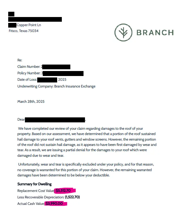 BC Roofing and Restoration, the contractor on the project, knew the damage was far more extensive than the insurance estimate reflected. The homeowner was left in a difficult situation: a damaged roof, a denied claim, and mounting repair costs.